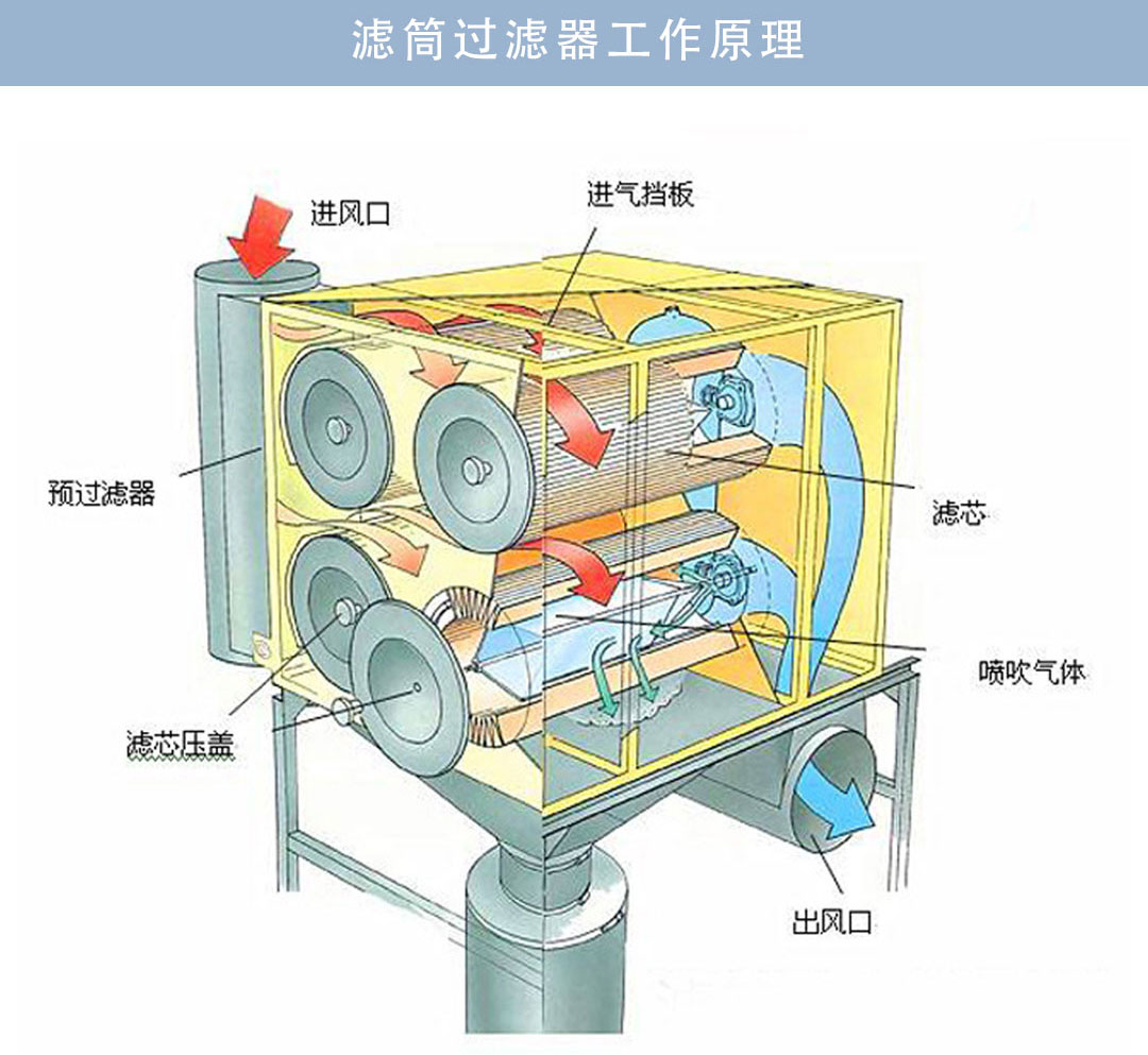 含塵廢氣進入脈沖褶式濾筒除塵器進風口后,由于氣流截面突然擴大及氣流分布板的作用,風速驟降,氣流中一部分粗大顆粒在風動力和慣性力的作用下相互碰撞,自然沉降到底部集灰斗;粒度細、密度小的塵粒,通過擴散和篩濾等組合效應,沉積在濾筒濾料的外表面上而被攔截,潔凈的氣體穿透濾料內壁,進入潔凈室由排氣管經風機抽出。過濾元件濾筒的阻力,隨著濾料表面粉塵積累層厚度的增加而增大。噴吹控制方式可以分為壓差控制、時序控制、人工控制。例如壓差控制:當阻力達到某一設定值時,數顯壓差儀表激發信號,脈沖控制儀或PLC控制程序收到反饋信號后,自動判斷數據,下指令進行連鎖執行動作,自動進行啟閉閥門噴吹清灰。此時,瞬間接通脈沖電源,電磁脈沖閥開啟,4公斤以上壓力的壓縮空氣瞬間引入周邊空氣作為二次放大的充足氣源,通過文氏管,一并高壓噴吹打入濾筒,使褶皺的濾筒瞬間膨脹變形鼓起,而產生振動,在高壓脈沖氣流沖刷的作用下,附著在濾筒外表面上的粉塵被一掃而光,掉入除塵器底部收集粉塵的灰斗收塵箱中。清灰完畢后,電磁脈沖閥關閉,濾料外表面粉塵清除后,阻力變小,濾料獲得再生,再次恢復攔截粉塵的功能。當阻力上升時,再次自動循環清灰再生工作。