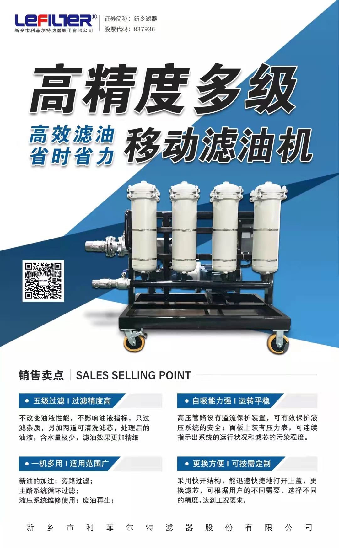高精度多級濾油機一種預過濾并為系統注油及凈化系統油液的理想設備。由多個精細過濾器組成,泵前一級粗過濾,泵后三級精過濾,故而該濾油機成為三級過濾高精度濾油機。油液在注入系統前必須經過凈化,未經凈化的新油其污染程度往往超過實際液壓規定的要求,即使是剛從油罐中抽取的新油也不適合直接使用。新油在加工、調和和儲存過程中都有可能混入各種污染物顆粒、水分等。所以在油品進入油箱及系統運行之前必須選擇合適的濾油機進行對油液的過濾。