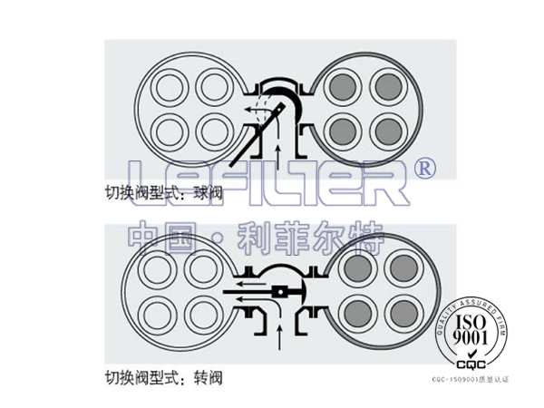 RFLD系列低壓管路過濾器主要用于液壓系統(tǒng)中介質(zhì)的精過濾,該過濾器可以在系統(tǒng)不關(guān)閉的情況下,通過該過濾器中間的3通切換閥完成雙筒的切換,以便于檢修和更換新的濾芯。三通切換閥通徑DN150以內(nèi)為球型切換,大于DN200的有轉(zhuǎn)閥和碟閥切換(如下圖示)。本過濾器可通過過濾器底部的安裝角裝固定在系統(tǒng)上。該過濾器上裝有壓差污染發(fā)訊器目視或電信號指示,用于本過濾器中的濾芯被污染物堵塞時發(fā)出訊號指示,以便維修人員更換濾芯,濾芯采用玻璃纖維材料折疊而成,具有過濾精度高、通油量大原始壓力損失小、納污能量大等優(yōu)點。