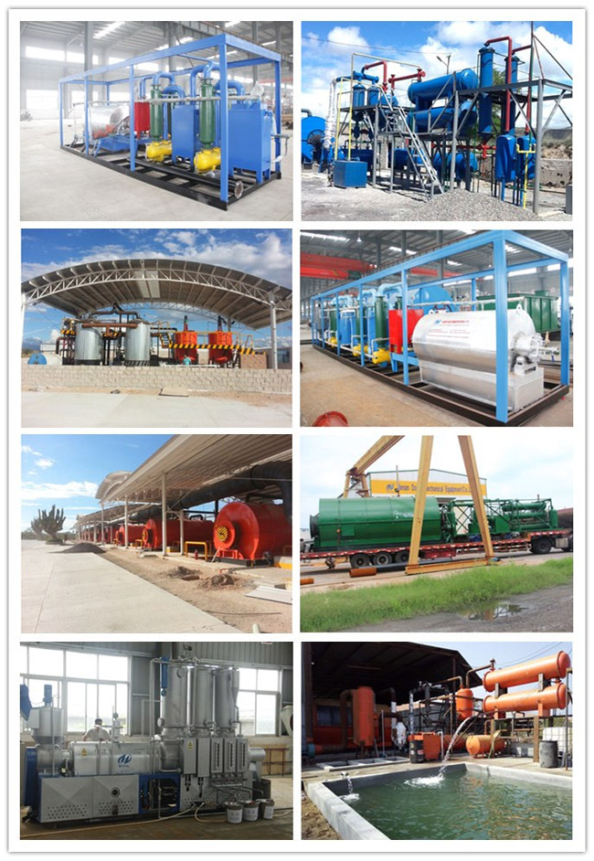 一 、廢橡膠煉油設備的工藝流程: 1、將原材料直接裝入裂解釜中,催化加熱,餾出油蒸汽,油氣經過汽包緩沖釋壓,進入冷凝器。 2、可液化部分,冷凝為燃料油,不可液化部分即同步氣體通過安全裝置水封、燃氣系統,一部分被可燃性氣體被捅入燃燒室充當燃料燒掉