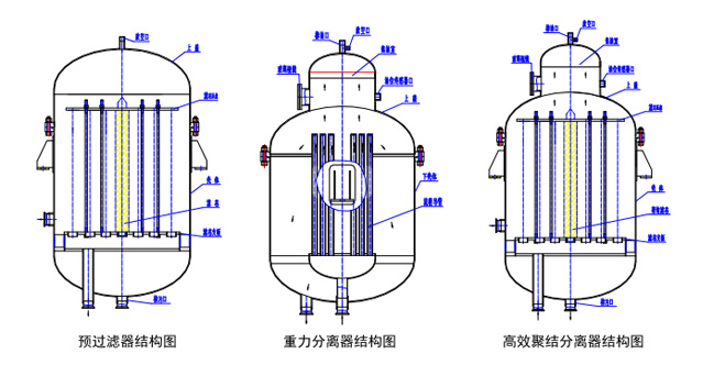 預過濾器罐體內裝有納污容量大、使用壽命長、過濾精度高的濾芯,污水進入過濾器后,較粗的顆粒會因慣性沉淀下來,較細的顆粒被濾芯表面攔截,較后凈水經過出水管線流出過濾器。隨著過濾時間增加,沉積在濾芯上的污染物越來越多,過濾器進出口壓差逐漸上升,當上升到較在允許工作壓差時(0.15MPa),說明濾芯已被堵塞,需要及時更換。另外, 由于預過濾器濾芯是用超細玻璃纖維濾紙制成,因其固有特性,使得預過濾芯同時又分擔一部分破乳的功能, 即將水包油進行破乳切開, 然后輸送至重力分離器內聚結上浮。預過濾器作為高效聚結分離器的保護性裝置,具有高的過濾精度,能夠過濾去除細小的懸浮物雜質(>10μm), 防止以顆粒為核心而不能破乳除油,因此有效延長后續設備中聚結濾芯和吸附濾芯的使用壽命,減少運行維護成本。預過濾器殼體整體采用不銹鋼304制作,表面鏡面拋光,外觀美觀大方,結構如下圖左所示。