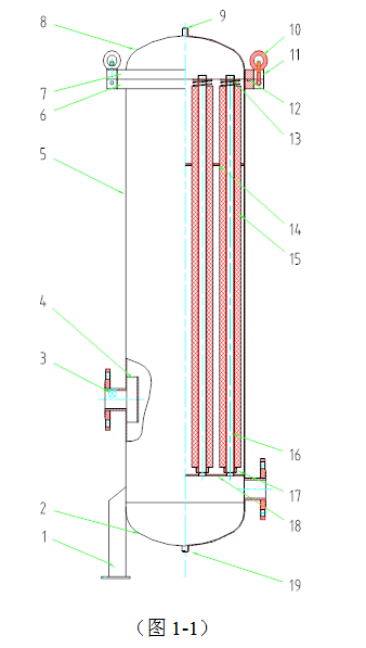 1-支腳 2-下封頭 3-進水口 4-檔水板 5-桶體 6-快裝下法蘭 7-快裝上法蘭 8-上封頭 9-壓力表口 10-吊母 11-吊片 12-密封圈