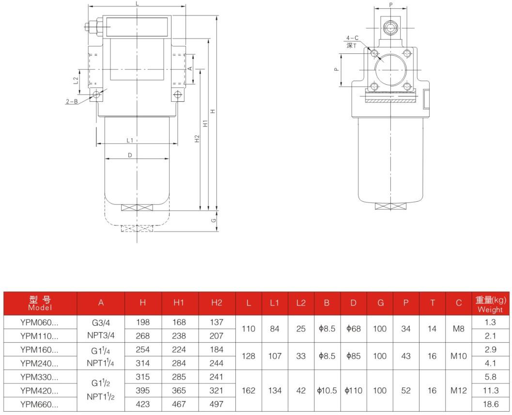 YPM160中壓過濾器安裝于液壓系統壓力管路中,濾除工作介質中的固體顆粒及膠狀物質,有效控制工作介質的污染度。可以根據你需要裝配壓差發訊器及旁通閥。